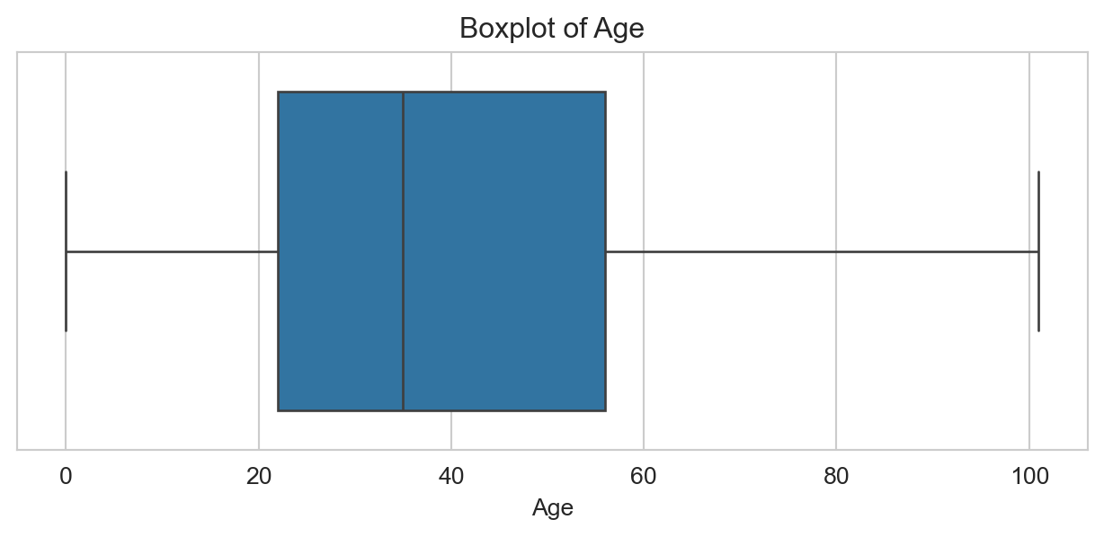# Creating a boxplot to check for outliers in the Age columnplt.figure(figsize=(8,3))sns.boxplot(x=df['Age'])plt.title('Boxplot of Age')plt.xlabel('Age')plt.show()