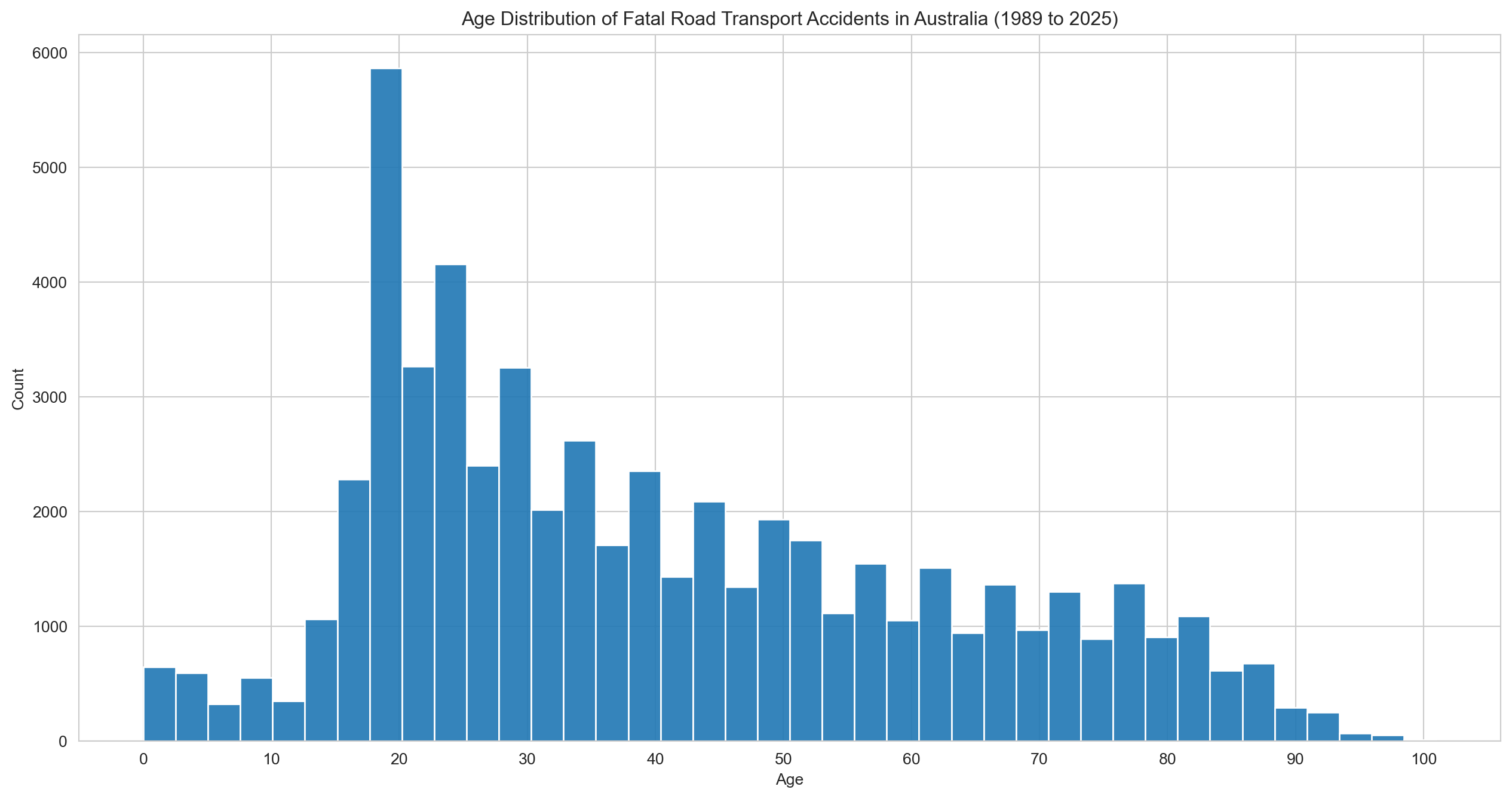 This section explores patterns in fatal road transport accidents in Australia from 1989 to 2025. Each row in the dataset represents a single fatality and includes demographic, geographic, and temporal details.
