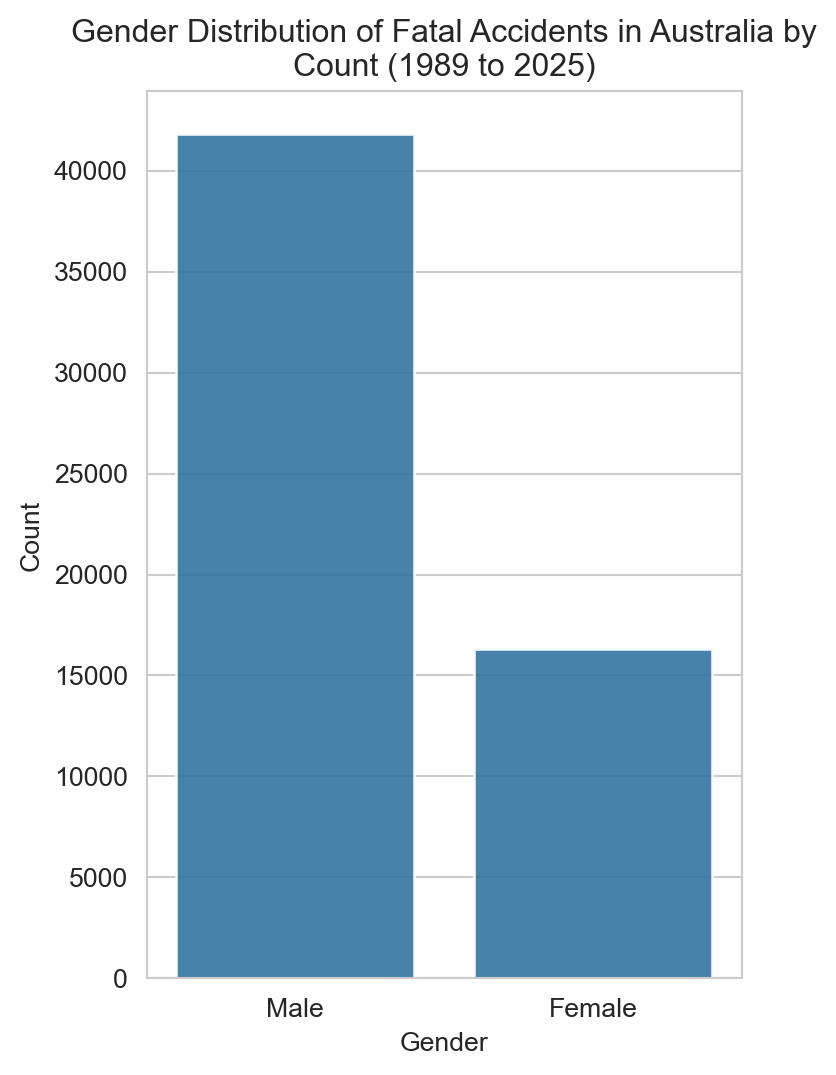 # Plot of fatal accidents by gendersns.set_style('whitegrid')plt.figure(figsize=(4,6))sns.countplot(x='Gender', data=df, alpha=0.9)plt.title(f"Gender Distribution of Fatal Accidents in Australia by\nCount ({earliest_year} to {latest_year})")plt.xlabel('Gender')plt.ylabel('Count')plt.show()