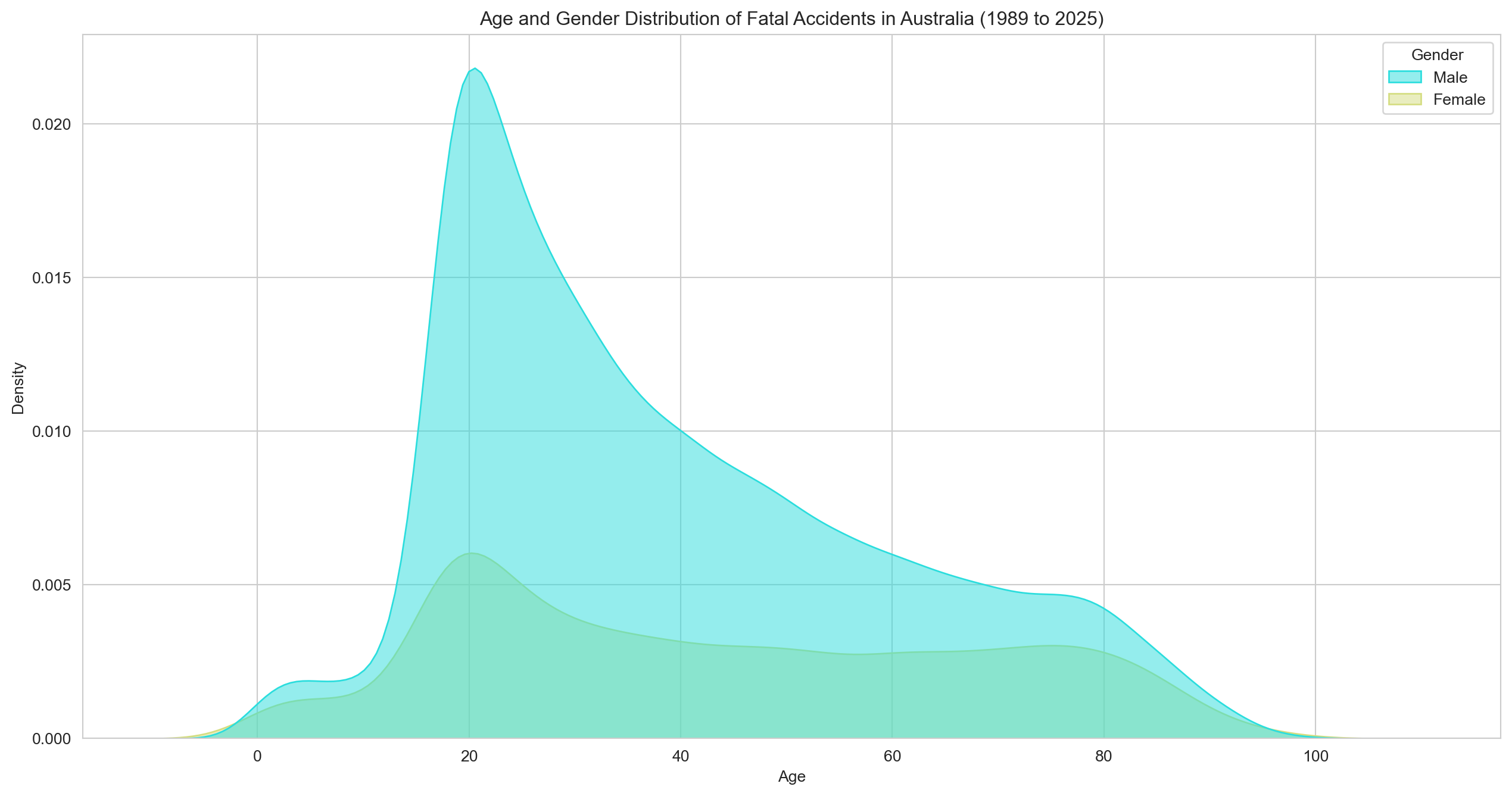 # Density plot of age and genderplt.figure(figsize=(16,8))sns.set_style('whitegrid')sns.kdeplot(data=df, x='Age', hue='Gender', fill=True, palette='rainbow', alpha=0.5)plt.title(f"Age and Gender Distribution of Fatal Accidents in Australia ({earliest_year} to {latest_year})")plt.xlabel('Age')plt.ylabel('Density')plt.show()