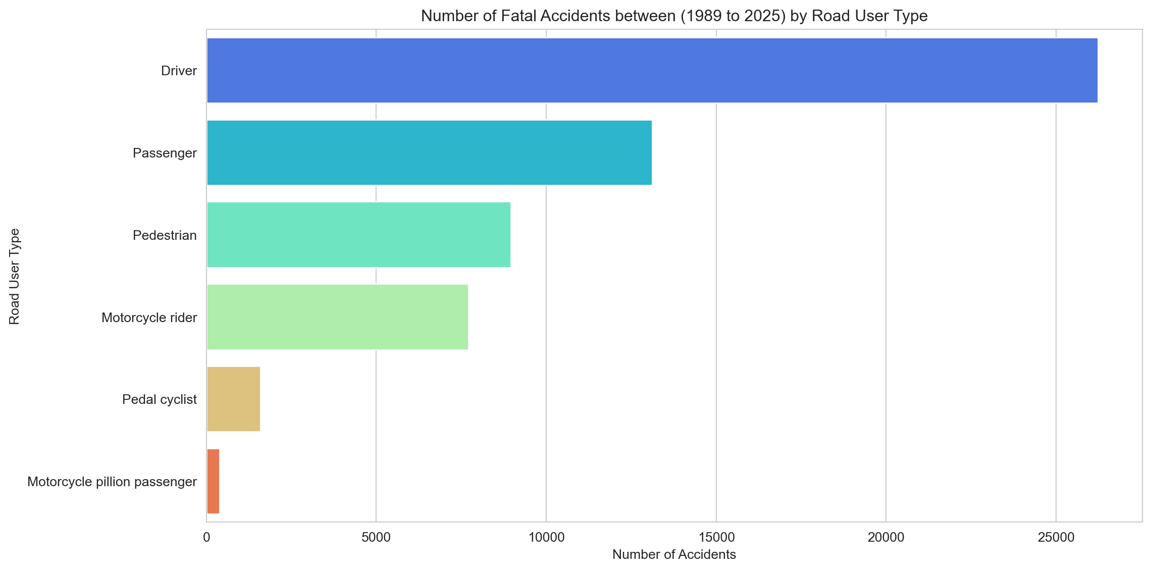 # Calculate the number of accidents by road userroad_user_counts = df['Road User'].value_counts().reset_index()road_user_counts.columns = ['Road User', 'Accidents']# Fatalities by Road User Typesns.set_style('whitegrid')plt.figure(figsize=(12,6))sns.barplot(x='Accidents', y='Road User', data=road_user_counts, hue='Road User', palette='rainbow')plt.title(f"Number of Fatal Accidents between ({earliest_year} to {latest_year}) by Road User Type")plt.xlabel('Number of Accidents')plt.ylabel('Road User Type')plt.tight_layout()plt.show()
