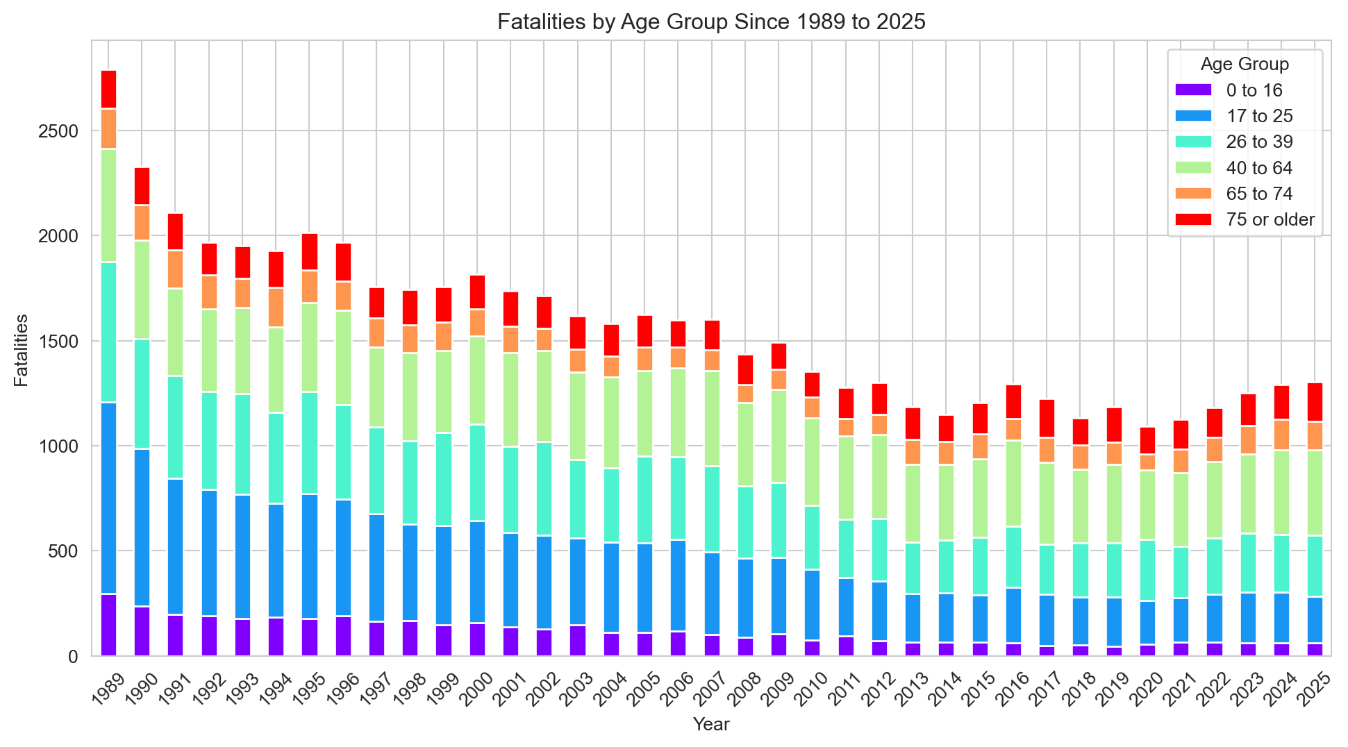 Fatalities have fallen across all age groups since 1989, with the proportional mix between groups staying broadly consistent.