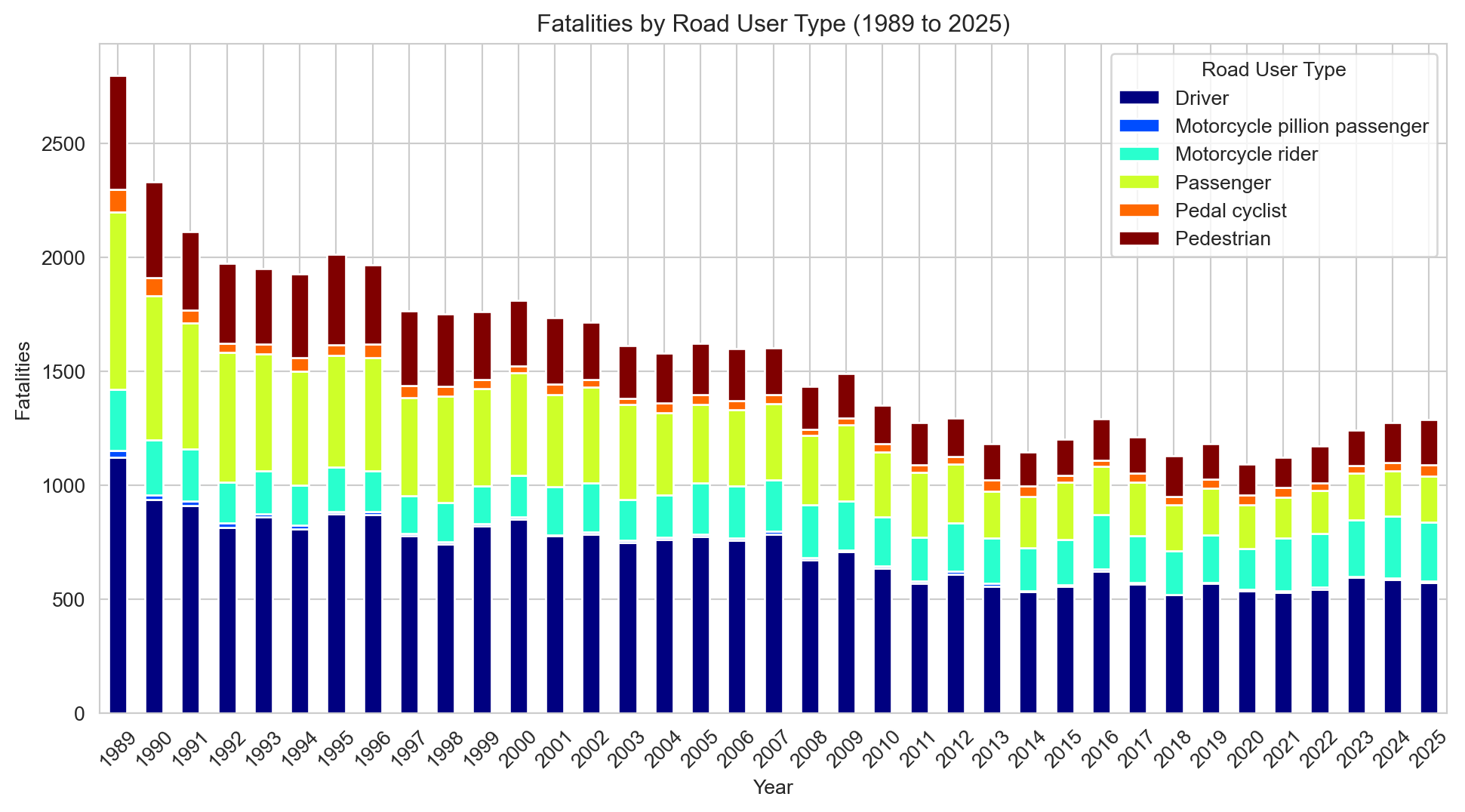 This notebook looks at fatal road crashes in Australia from 1989 onward using the Australian Road Deaths Database (ARDD). The focus is simple: who is most affected, where risk is concentrated, and how patterns have shifted over time.