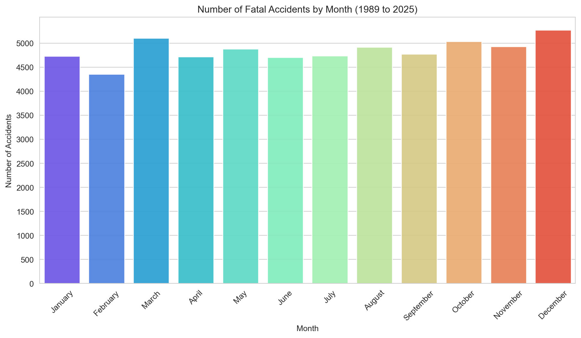 # Plot the number of accidents by monthsns.set_style('whitegrid')plt.figure(figsize=(12,6))sns.barplot(x='Month', y='Accidents', data=month_counts, hue='Month', palette='rainbow', alpha=0.9)plt.title(f"Number of Fatal Accidents by Month ({earliest_year} to {latest_year})")plt.xlabel('Month')plt.ylabel('Number of Accidents')plt.xticks(rotation=45)plt.yticks(range(0, 5500, 500))plt.show()