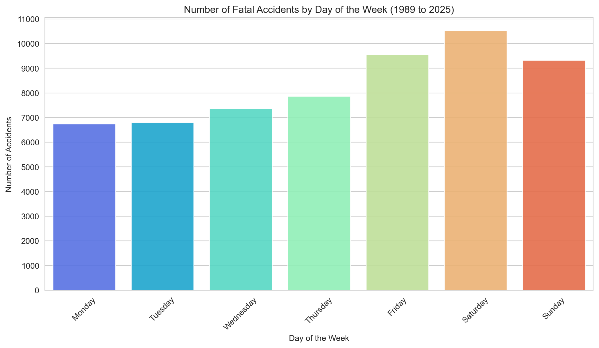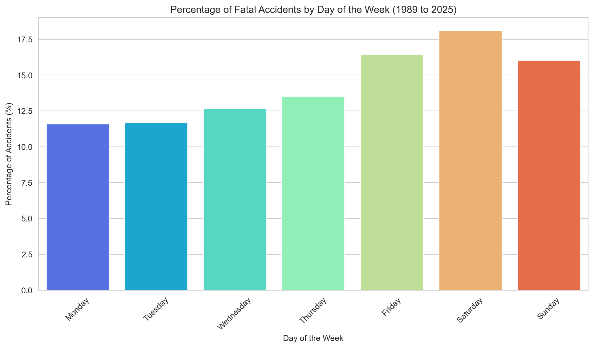 day_counts['Percentage'] = (day_counts['Accidents'] / day_counts['Accidents'].sum()) *100sns.set_style('whitegrid')plt.figure(figsize=(12,6))sns.barplot(x='Day', y='Percentage', data=day_counts, hue='Day', palette='rainbow')plt.title(f"Percentage of Fatal Accidents by Day of the Week ({earliest_year} to {latest_year})")plt.xlabel('Day of the Week')plt.ylabel('Percentage of Accidents (%)')plt.xticks(rotation=45)plt.show()