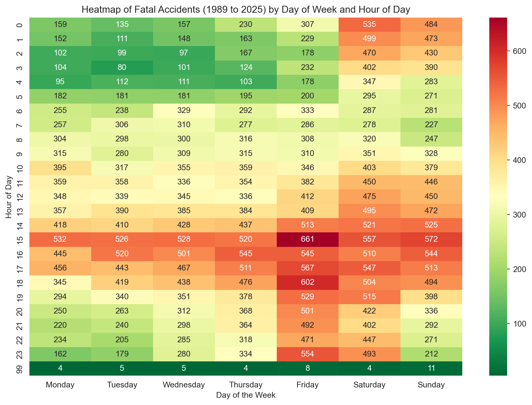 # We will create a new data frame for this visualisation because we have to do some manipulation that involves dropping rows. # Creating a new dataframeheatmap_df = df[['Time', 'Dayweek']].copy()# Dropping rows with missing valuesheatmap_df = heatmap_df.dropna(subset=['Time'])# Then we will extract the hour from the time field to make it easier to create a heatmapheatmap_df['Hour'] = heatmap_df['Time'].str.split(':').str[0].astype(int)# Next we need to create a pivot table to convert the data into wide formatpivot_table = pd.pivot_table(heatmap_df, values='Time', index=['Hour'], columns=['Dayweek'], aggfunc='count', fill_value=0)# Finally plotting a heatmapplt.figure(figsize=(12, 8))sns.heatmap(pivot_table[day_order], annot=True, cmap='RdYlGn_r', # Take a colour pallet from https://loading.io/color/feature/RdYlGn-9/ and use _r to flip it so that red is higher and green is lower fmt='g')plt.title(f"Heatmap of Fatal Accidents ({earliest_year} to {latest_year}) by Day of Week and Hour of Day")plt.xlabel('Day of the Week')plt.ylabel('Hour of Day')plt.show()