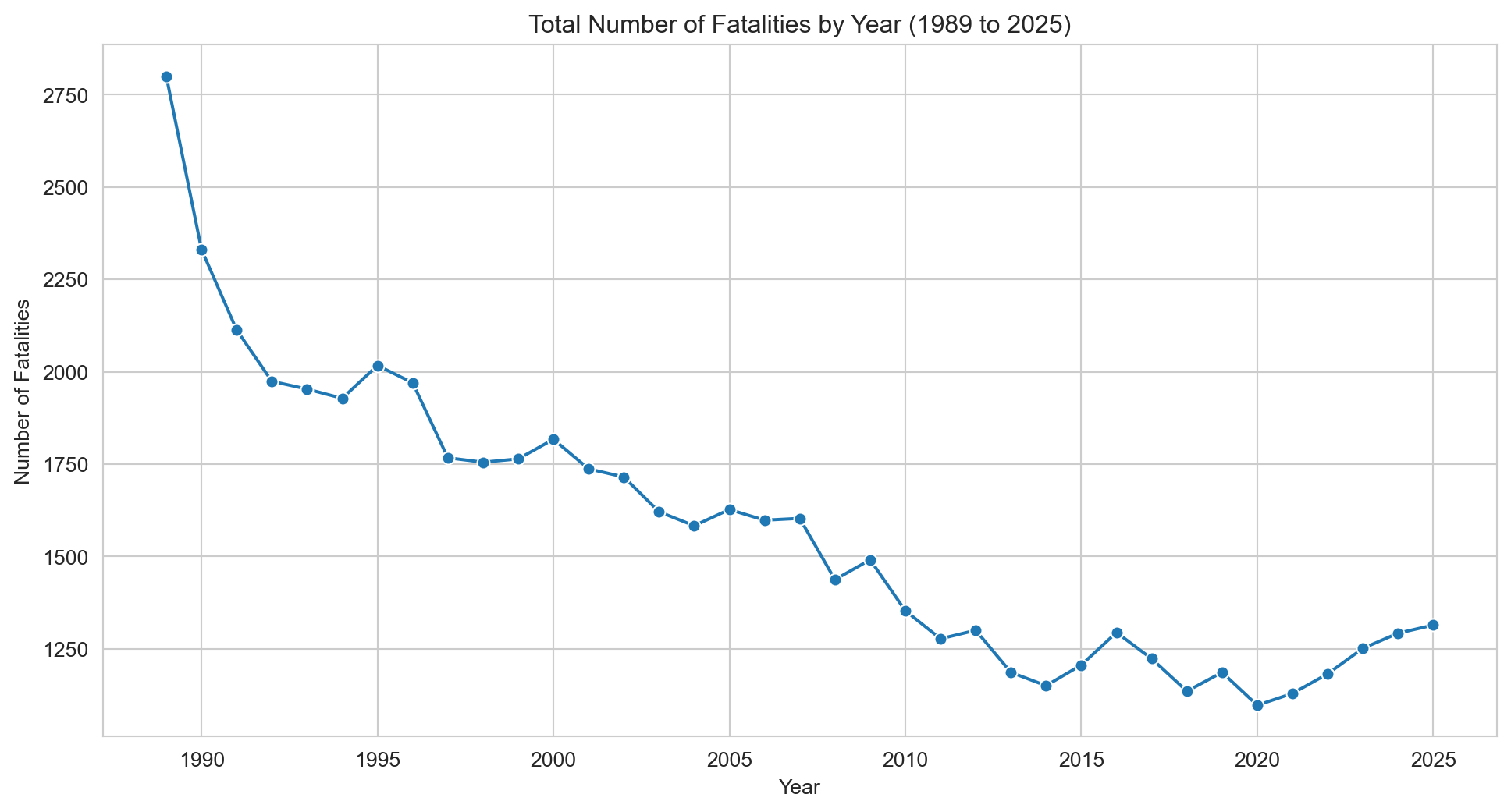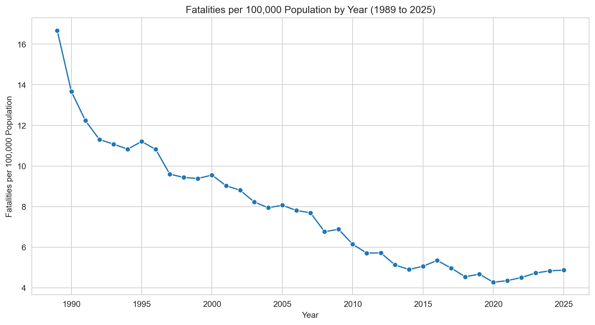 Road fatalities have steadily declined from 1989 to 2025, both in raw numbers and when adjusted per 100,000 population.