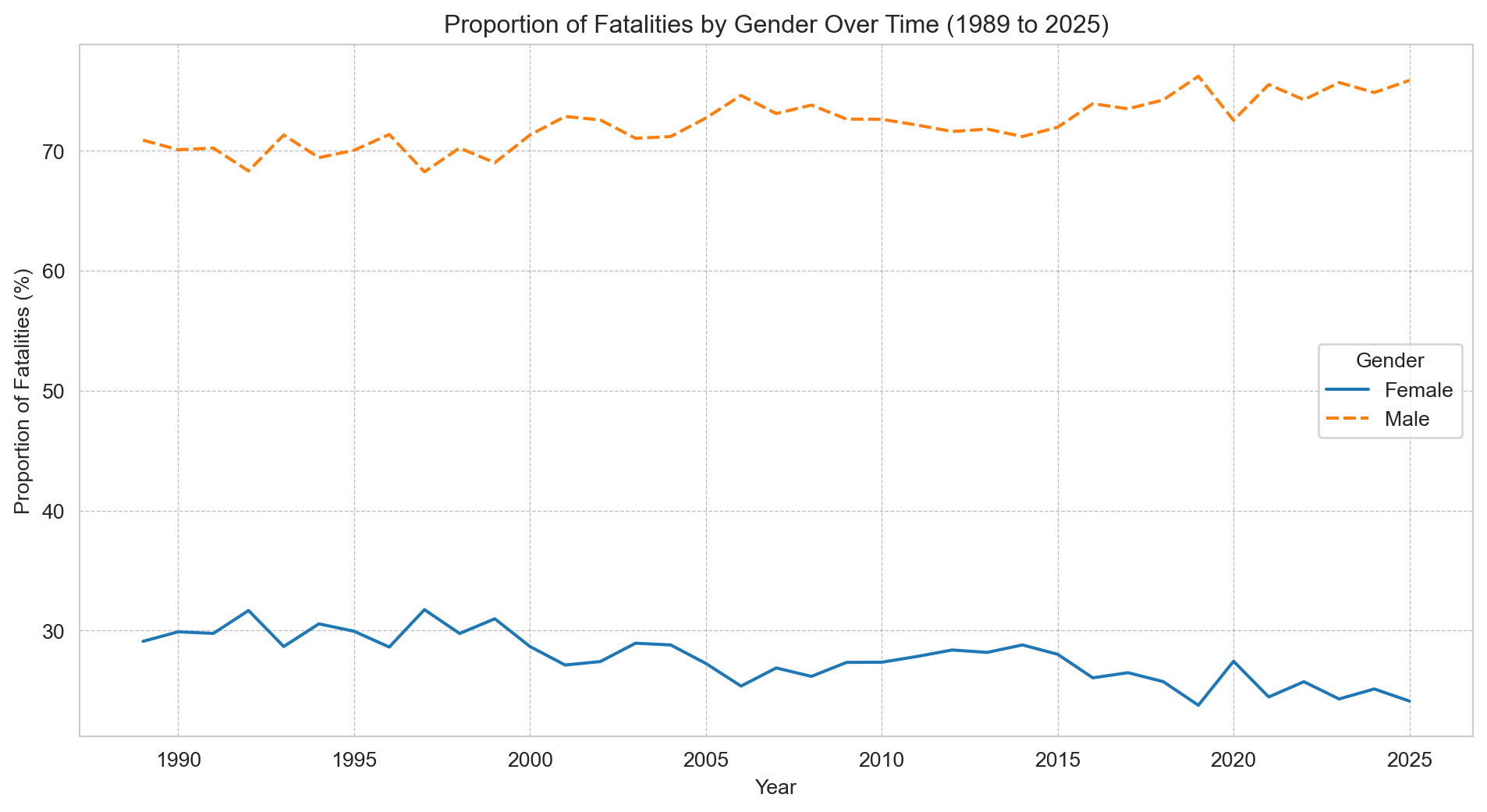 # Grouping the number of fatalities each year by gendergender_fatalities = df.groupby(['Year', 'Gender'])['Crash ID'].size().reset_index(name='Fatalities')# Calculating total fatalities per yeartotal_fatalities_per_year = gender_fatalities.groupby('Year')['Fatalities'].sum().reset_index(name='Total Fatalities')# Merging the dataframes and calculating proportionsgender_fatalities = pd.merge(gender_fatalities, total_fatalities_per_year, on='Year')gender_fatalities['Proportion'] = (gender_fatalities['Fatalities'] / gender_fatalities['Total Fatalities']) *100# Pivoting the data for easier plottinggender_proportions_pivot = gender_fatalities.pivot(index='Year', columns='Gender', values='Proportion')# Plottingsns.set_style('whitegrid')plt.figure(figsize=(12, 6))sns.lineplot(data=gender_proportions_pivot)plt.title(f"Proportion of Fatalities by Gender Over Time ({earliest_year} to {latest_year})")plt.xlabel('Year')plt.ylabel('Proportion of Fatalities (%)')plt.grid(color='grey', linestyle='--', linewidth=0.5, alpha=0.5)plt.legend(title='Gender')plt.show()
