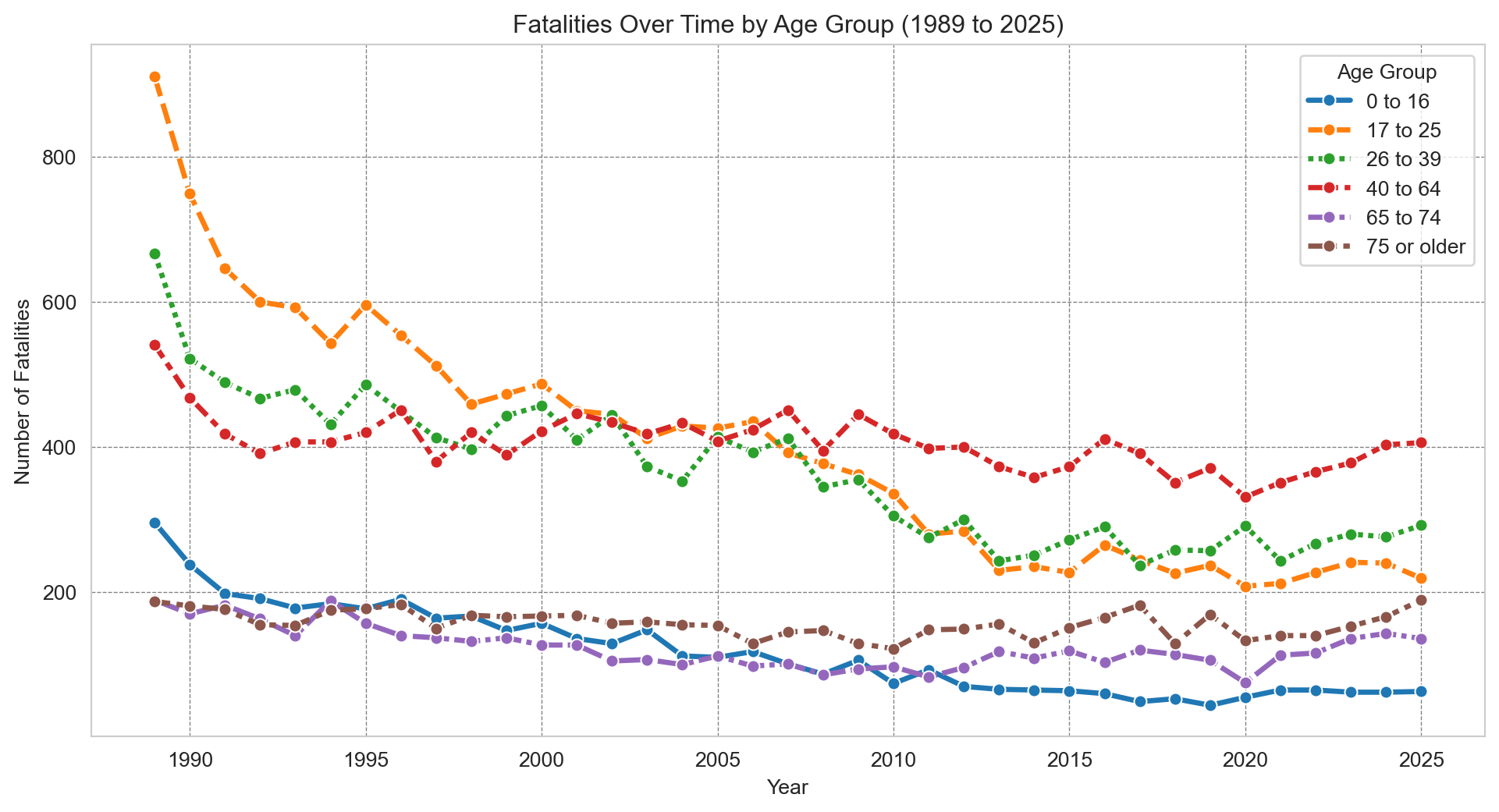 Every age group has seen a decline, but the 17–25 cohort stands out — the drop is steeper than any other, likely reflecting graduated licensing reforms introduced across Australian states in the 1990s and 2000s. Around the same time, 40–64 year olds overtook younger drivers as the age group with the highest annual fatality count.