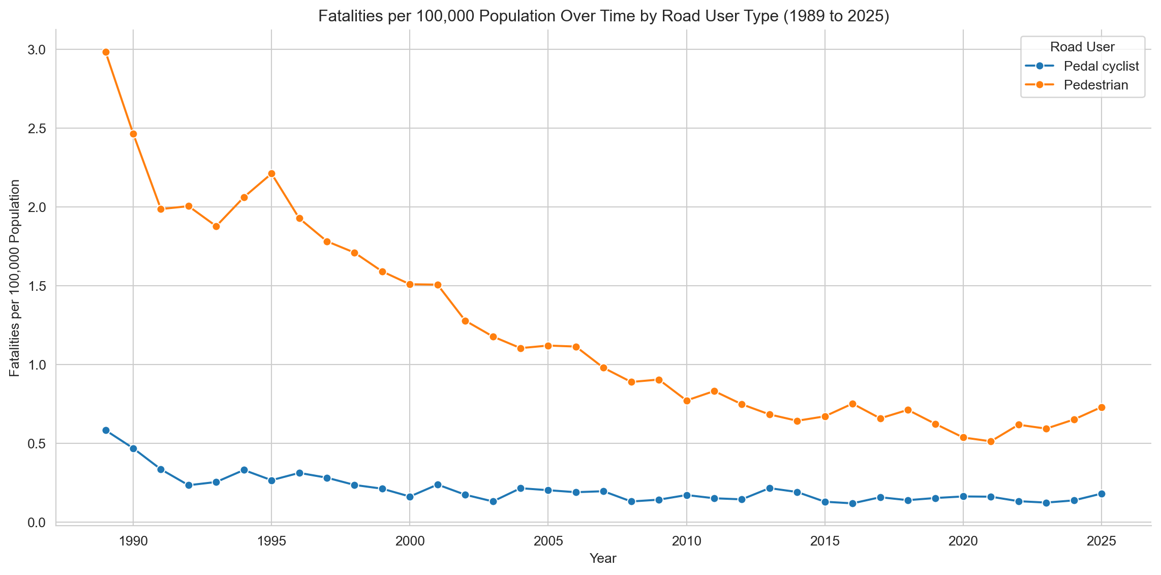 Pedestrian fatalities have fallen steadily since 1989. Cyclist deaths have barely moved since the mid-1990s — a gap explored further in the vulnerable road users notebook.