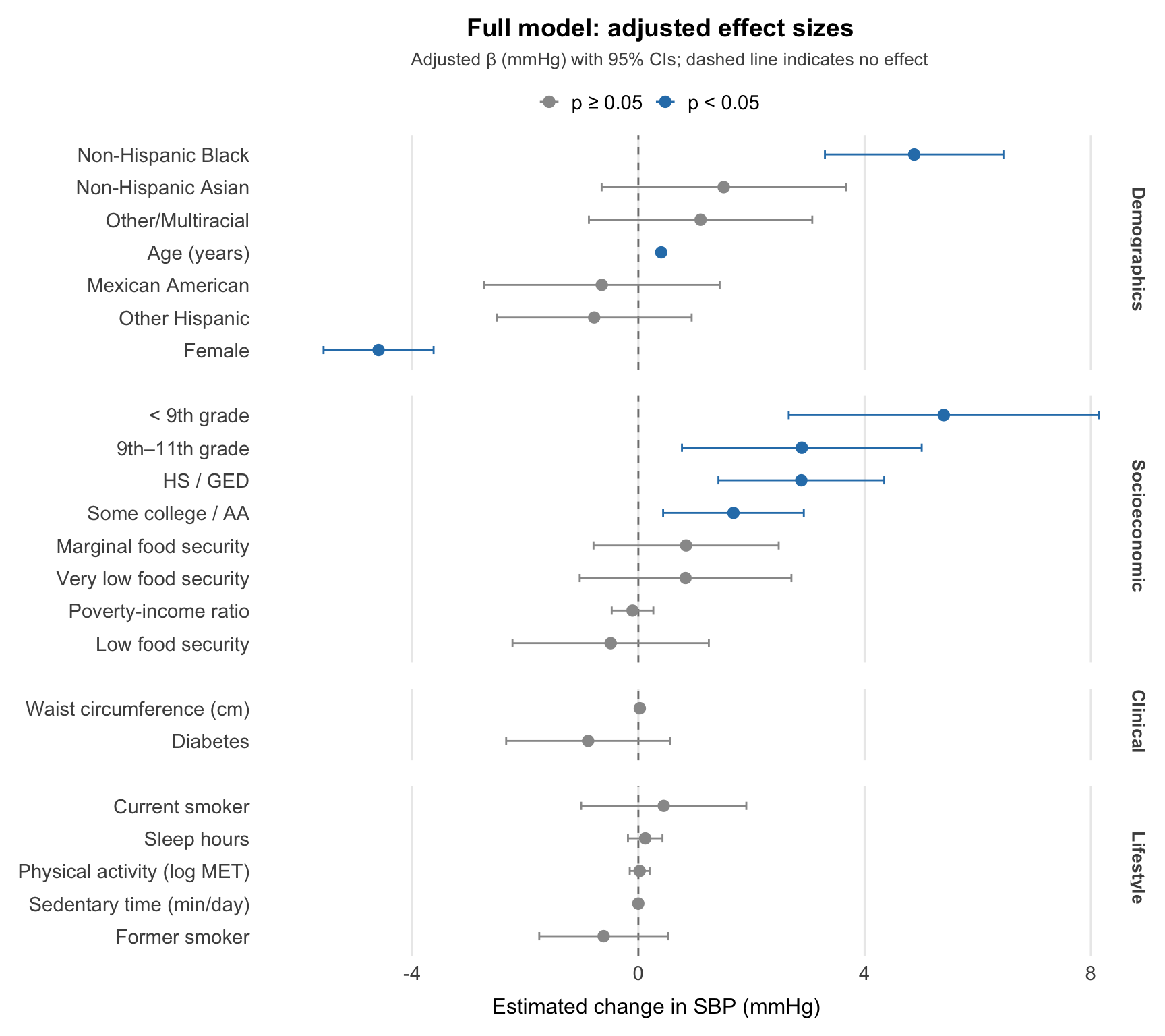 The plot shows adjusted effects on systolic blood pressure, with statistically significant estimates highlighted in blue.
