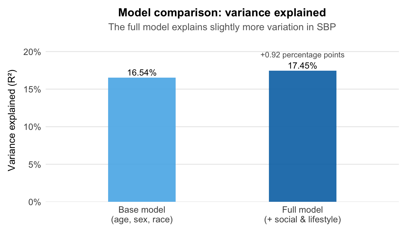 The full model explains slightly more variation in SBP, but the gain is modest — social and lifestyle factors add less than one percentage point beyond demographics alone.