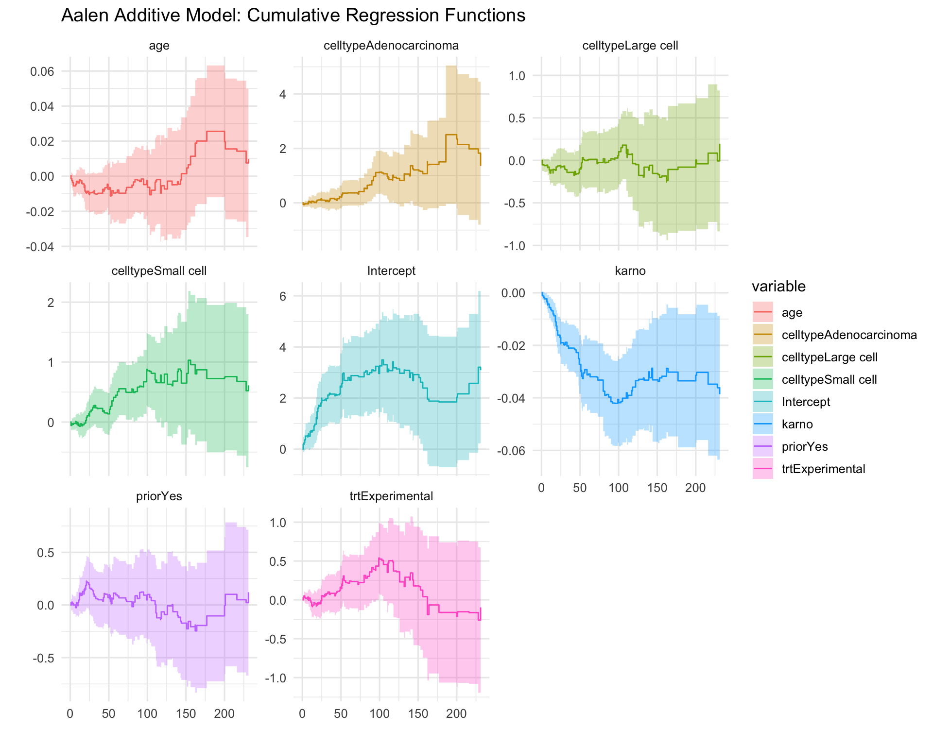 The result is broadly the same. Karnofsky score remains the strongest and most stable predictor of survival, while treatment group and prior therapy contribute little on their own. Seeing the same pattern across two different modelling approaches adds confidence to the overall interpretation.