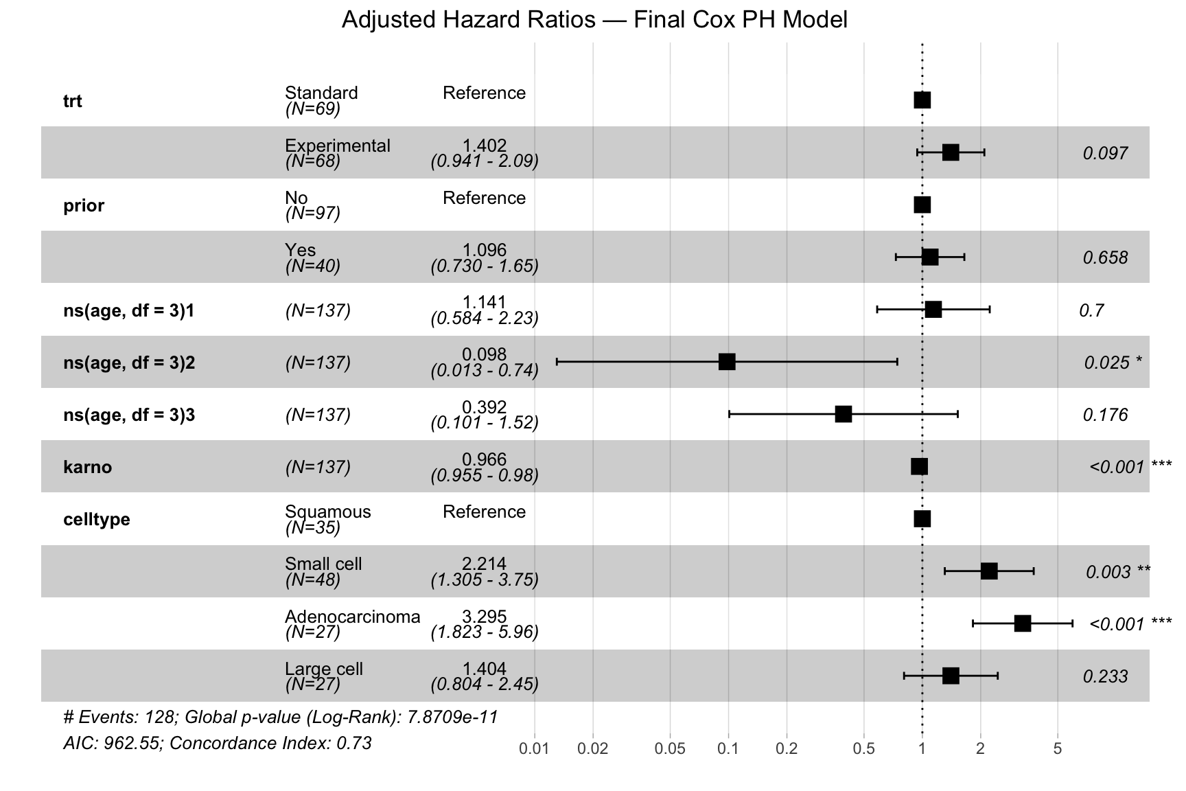 This plot shows the final adjusted Cox model, including treatment group, prior therapy, age, Karnofsky score, and cell type.