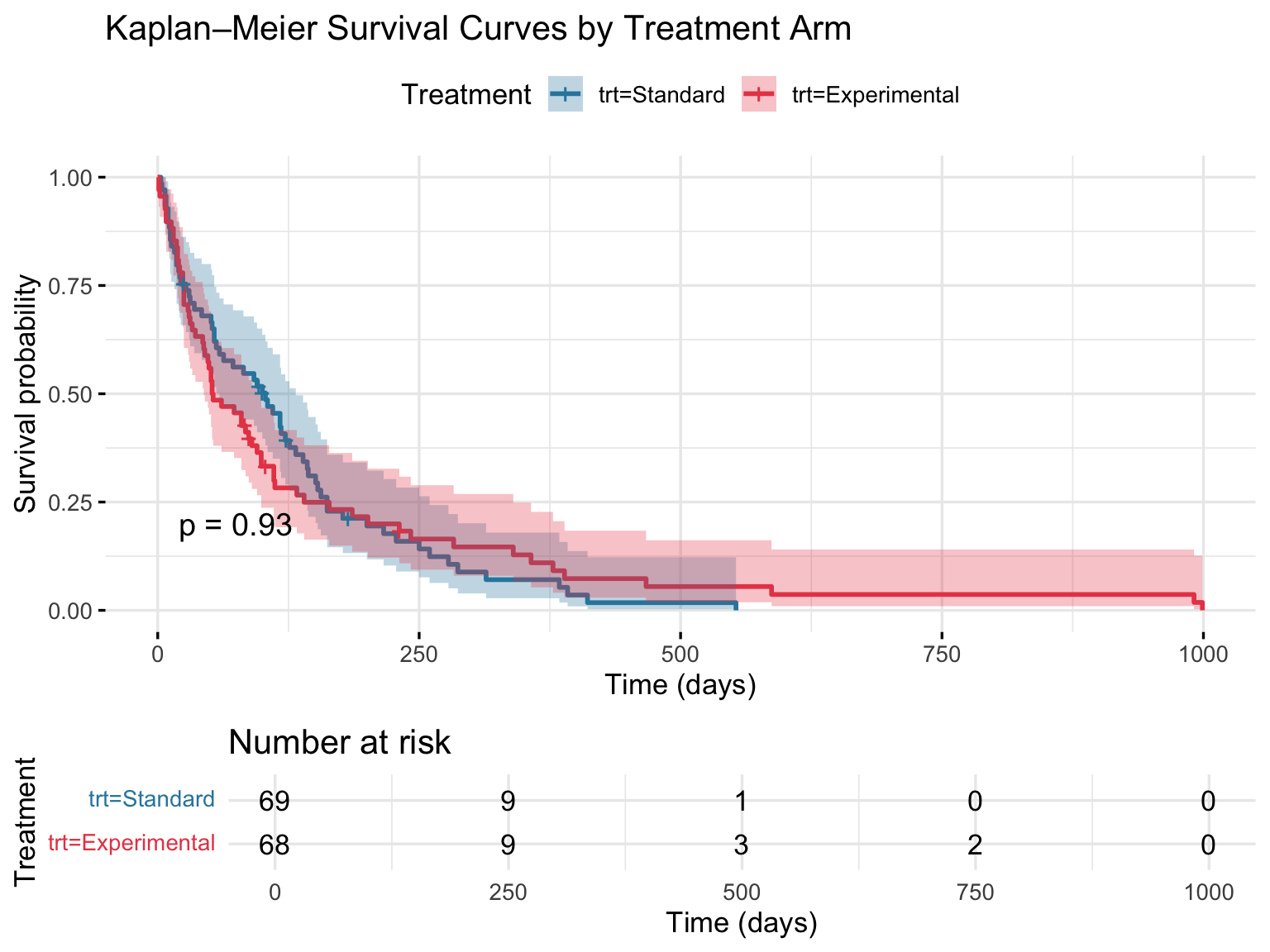 # KM medians overall and by armkm_all <-survfit(Surv(time, status) ~1, data = veteran2)km_by <-survfit(Surv(time, status) ~ trt, data = veteran2)overall <-surv_median(km_all)byarm <-surv_median(km_by)med_all <-round(overall$median)ci_all_l <-round(overall$lower); ci_all_u <-round(overall$upper)med_std <-round(byarm$median[byarm$strata =="trt=Standard"])ci_std_l <-round(byarm$lower [byarm$strata =="trt=Standard"])ci_std_u <-round(byarm$upper [byarm$strata =="trt=Standard"])med_exp <-round(byarm$median[byarm$strata =="trt=Experimental"])ci_exp_l <-round(byarm$lower [byarm$strata =="trt=Experimental"])ci_exp_u <-round(byarm$upper [byarm$strata =="trt=Experimental"])# Baseline summariesn_total <-nrow(veteran2)n_by_trt <- veteran2 %>%count(trt, name ="n")n_std_n <- n_by_trt$n[n_by_trt$trt =="Standard"]n_exp_n <- n_by_trt$n[n_by_trt$trt =="Experimental"]q_age <-quantile(veteran2$age, probs =c(0.25, 0.5, 0.75))q_karno <-quantile(veteran2$karno, probs =c(0.25, 0.5, 0.75))med_age <-round(q_age[2]); iqr_age_l <-round(q_age[1]); iqr_age_u <-round(q_age[3])med_karno <-round(q_karno[2]); iqr_kar_l <-round(q_karno[1]); iqr_kar_u <-round(q_karno[3])cell_pct <-round(100*prop.table(table(veteran2$celltype)), 1)prior_pct <-round(100*prop.table(table(veteran2$prior)), 1)prior_yes <-unname(prior_pct["Yes"])lr <-survdiff(Surv(time, status) ~ trt, data = veteran2)lr_p <-signif(1-pchisq(lr$chisq, length(lr$n) -1), 3)deaths <-sum(veteran2$status ==1)censored <-sum(veteran2$status ==0)deaths_pct <-round(100* deaths / n_total, 1)cens_pct <-round(100* censored / n_total, 1)cat(glue("**Study population**- {n_total} male patients; Standard = **{n_std_n}**, Experimental = **{n_exp_n}**- Median age: **{med_age}** years (IQR: {iqr_age_l}–{iqr_age_u})- Median Karnofsky score: **{med_karno}** (IQR: {iqr_kar_l}–{iqr_kar_u})- Cell type: Squamous {cell_pct['Squamous']}%, Small cell {cell_pct['Small cell']}%, Adenocarcinoma {cell_pct['Adenocarcinoma']}%, Large cell {cell_pct['Large cell']}%- Prior therapy: **{prior_yes}%** yes**Survival outcomes**- Median survival (all): **{med_all}** days (95% CI: {ci_all_l}–{ci_all_u})- Standard arm: **{med_std}** days (95% CI: {ci_std_l}–{ci_std_u})- Experimental arm: **{med_exp}** days (95% CI: {ci_exp_l}–{ci_exp_u})- Log-rank *p* = **{lr_p}****Events**- Deaths: **{deaths}** ({deaths_pct}%) | Censored: **{censored}** ({cens_pct}%)"))